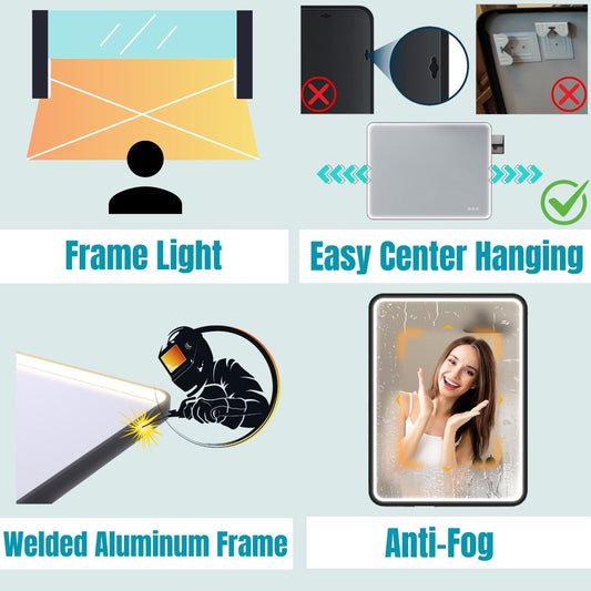 Waterpar® Rectangular Black Framed Anti-Fog LED Wall Bathroom Vanity Mirror with Front Light