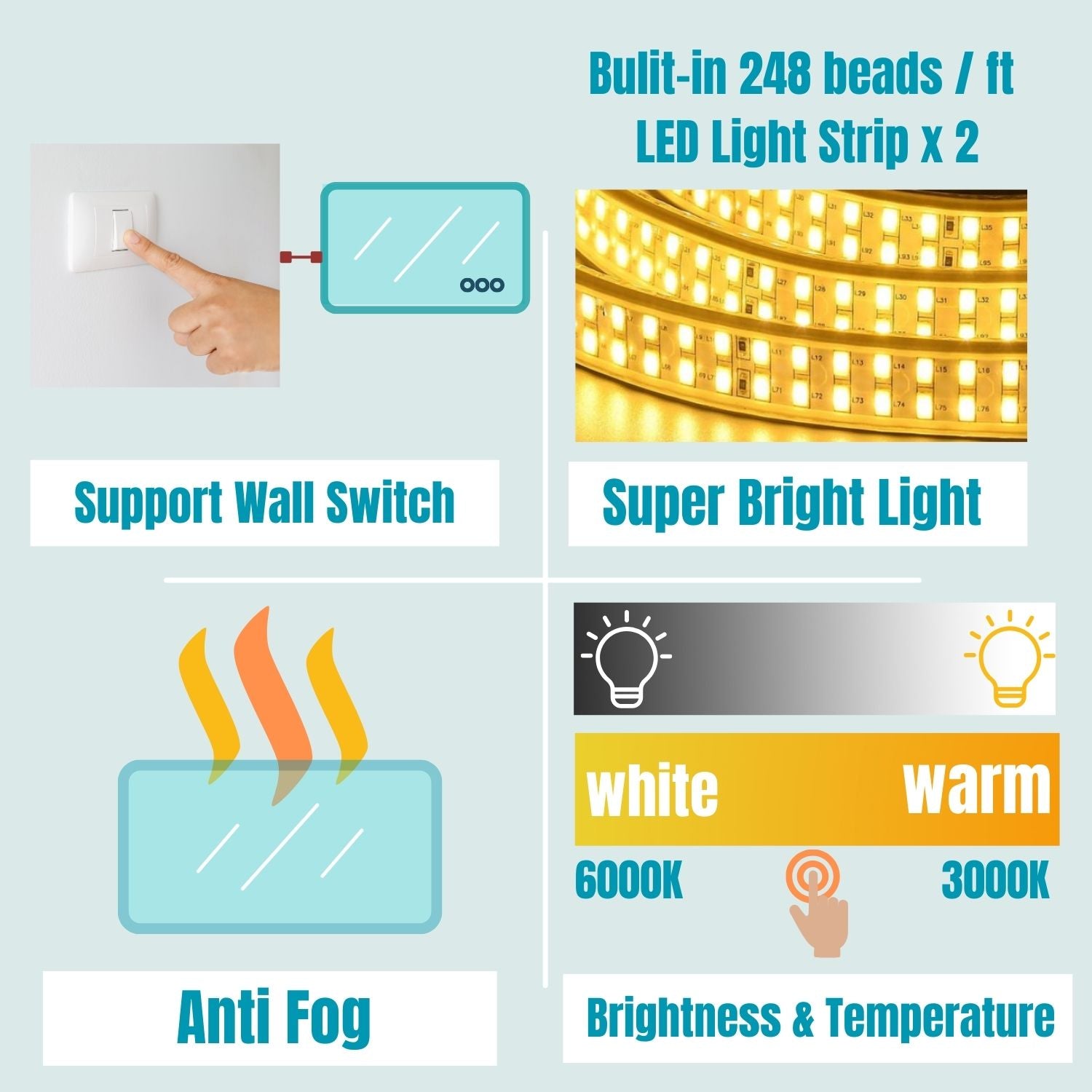 WATERPAR LED lighted bathroom mirror is a stunning example of modern elegance and sophistication. Crafted with high-quality silver-backed glass, it delivers a clear and flawless reflection. This LED front-lit mirror is not only aesthetically pleasing but also functional, offering dimmable daylight illumination perfect for cosmetics, hygiene, and dressing. Experience true luxury with its built-in defogger, which keeps the mirror fog-free every time. If you have any questions during the customization process, feel free to reach out to our online customer service with the desired size for your custom mirror.